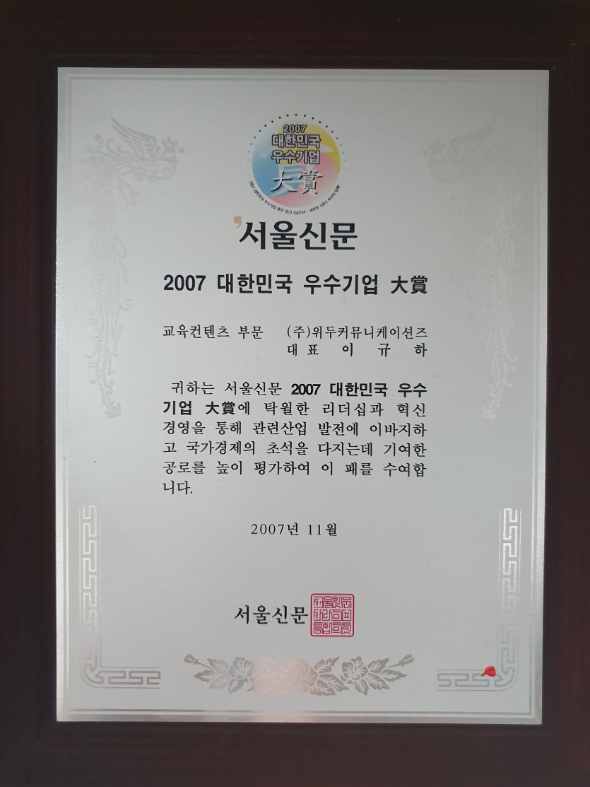 2007 대한민국 우수기업 대상 페이지 정보 작성자 WeDu 댓글 0건 조회 5,883회 작성일 19-05-30 19:31 본문 2007-11-00 대상 교육 콘텐츠 부문 2007 대한민국 우수기업 대상 서울신문 List Previous제 8회 디지털 이노베이션 대상 19.05.30