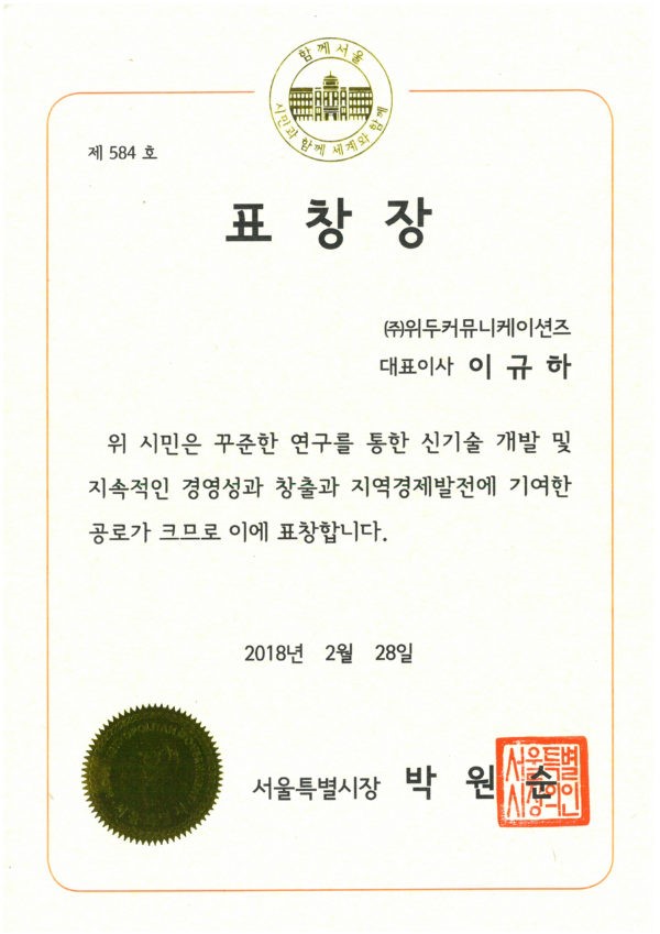 서울특별시장 표창장 페이지 정보 작성자 WeDu 댓글 0건 조회 6,734회 작성일 19-05-30 19:35 본문 2018-02-28 표창장 제 584호 신기술 개발 및 지속적인 경영성 창출, 지역 경제 발전 기여 서울특별시장 박원순 List Previous2018 소년한국 우수 어린이 도서 19.05.30 Next서울클러스터 어워드 우수상 19.05.30